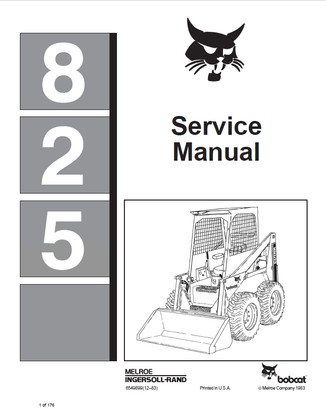 [12/1983]Service manual includes detailed repair and troubleshoot information, installation instructions, specifications for Bobcat Skid Steer Loaders 825.