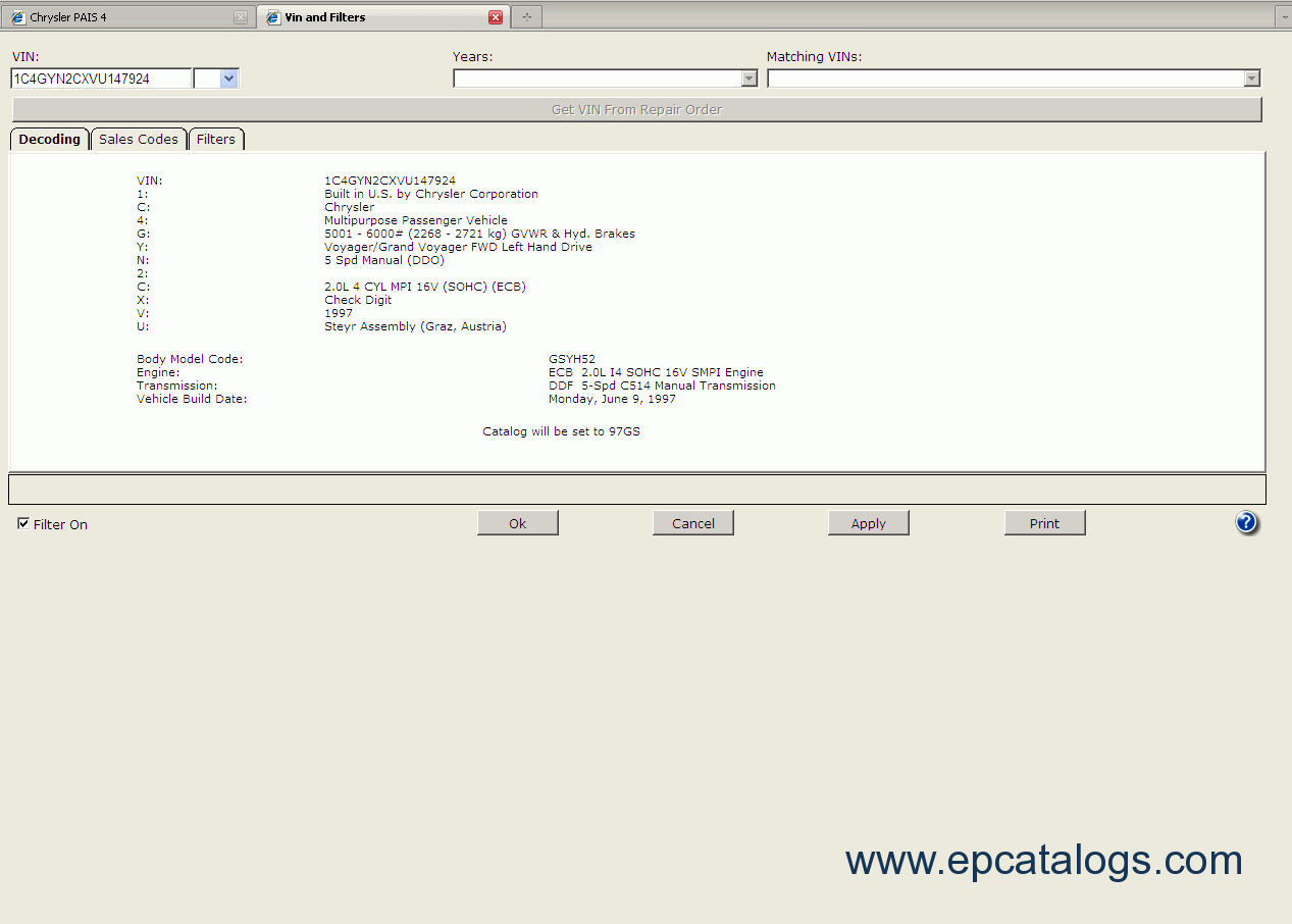 Original spare parts catalog Chrysler PAIS4 2013 (USA + Europe) contains information on spare parts and accessories, parts manuals, spare parts books for all models of equipment Chrysler, from 1985 to 2013.