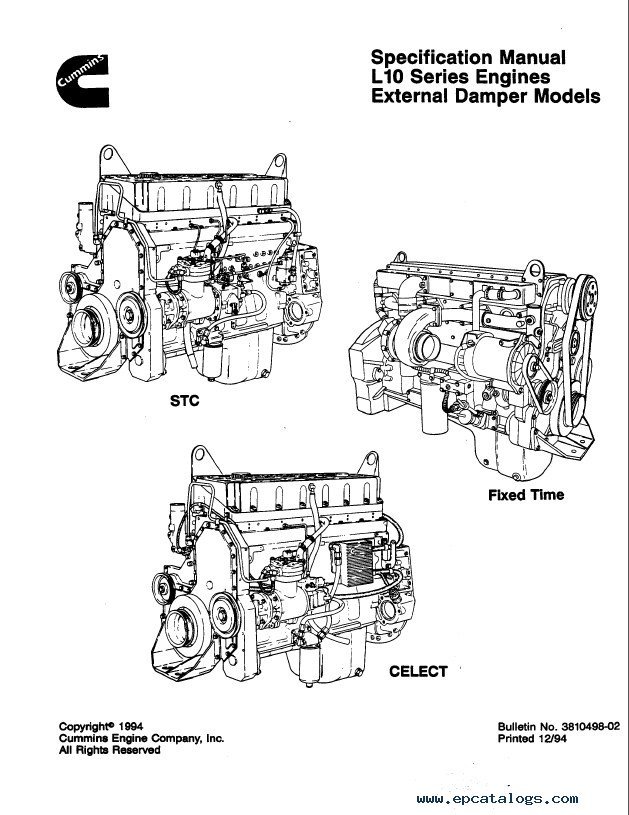 These manuals contain complete rebuild specifications and information for the external damper model L10 engines, and all associated components manufactured by Cummins Enigne Company.