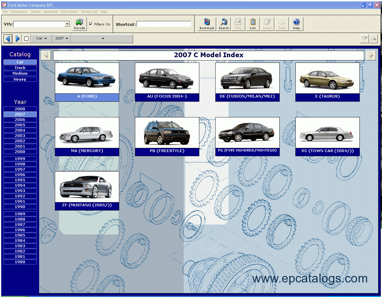 Ford USA EPC is the electronic parts lookup system that allows user to easily find OE part numbers. This program has VIN decoding and filtering that allows to only displays vehicle-specific parts information. Ford USA EPC contains information for all US Ford Corp. models of 1980 - 2009 model years.