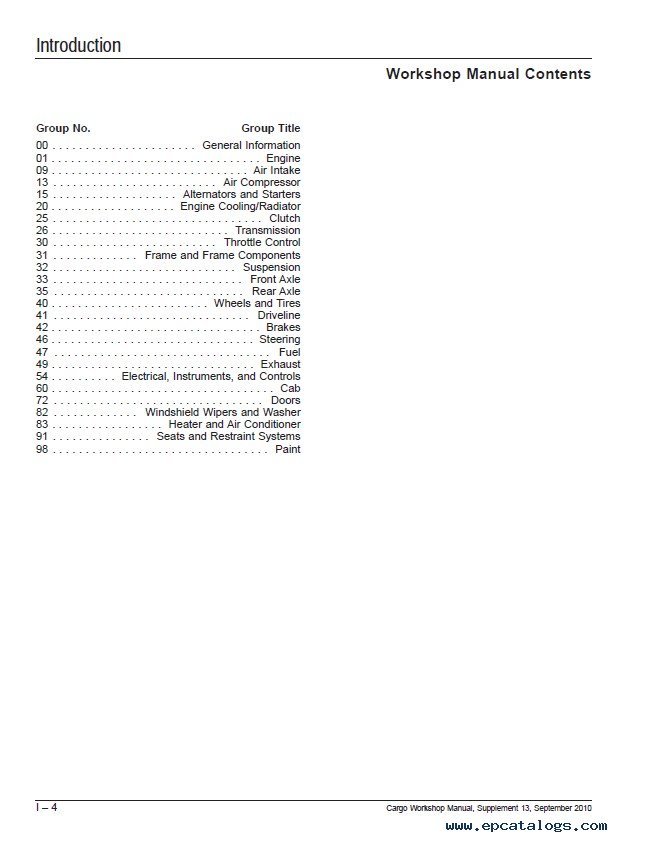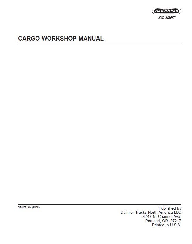 [09/2010]Workshop manual contains guidance on repair and maintenance, description of repair and troubleshoot procedures, specific installation instructions and other service information for trucks Freightliner Cargo.