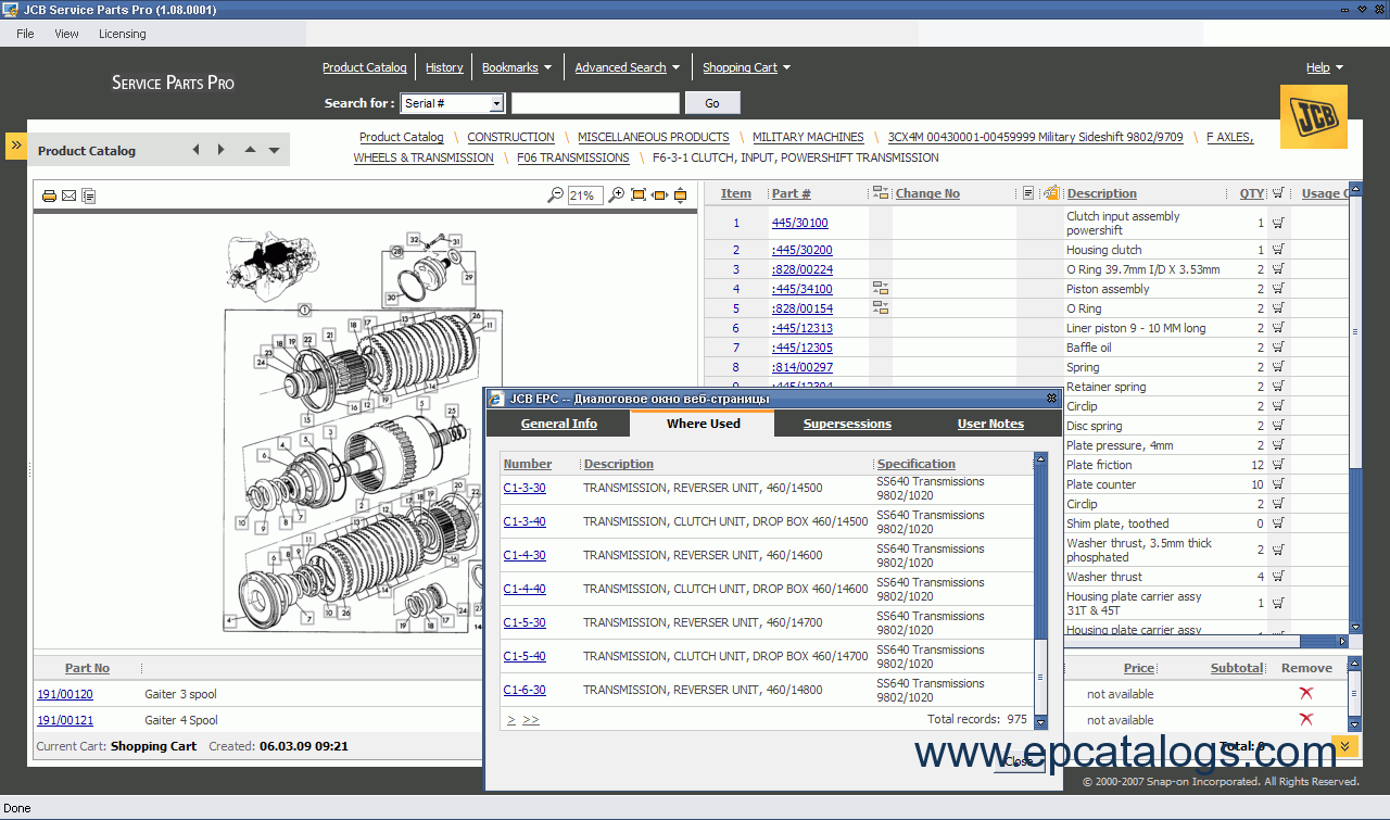JCB Service Parts Pro 2009 is an electronic database catalog of original spare parts across the range of JCB, the book contains spare parts and accessories, spare parts manuals, wiring diagrams, hydraulic diagrams, detailed and clear guidance on repair and maintenance of all equipment models, JCB, which will help the dealer to timely and quality care in the repair, maintenance, calibration, installation and dismantling of certain parts of vehicles JCB.