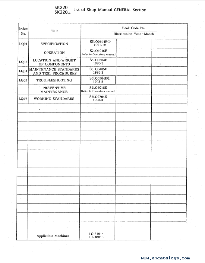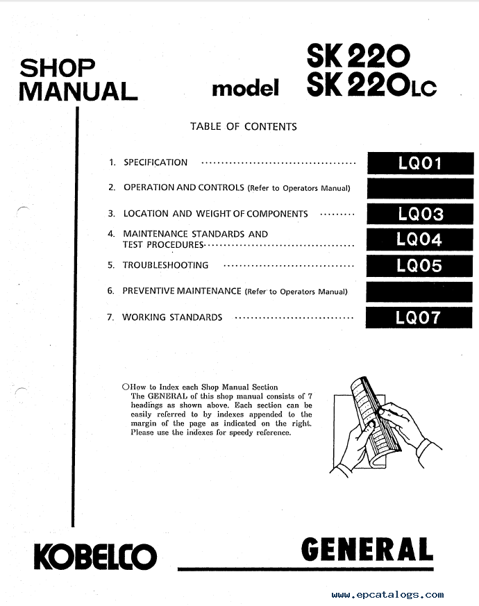[01/2011]This shop manual includes instructions for repair and maintenance, special instructions, maintenance manuals for hydraulic excavators Kobelco SK220(LC).