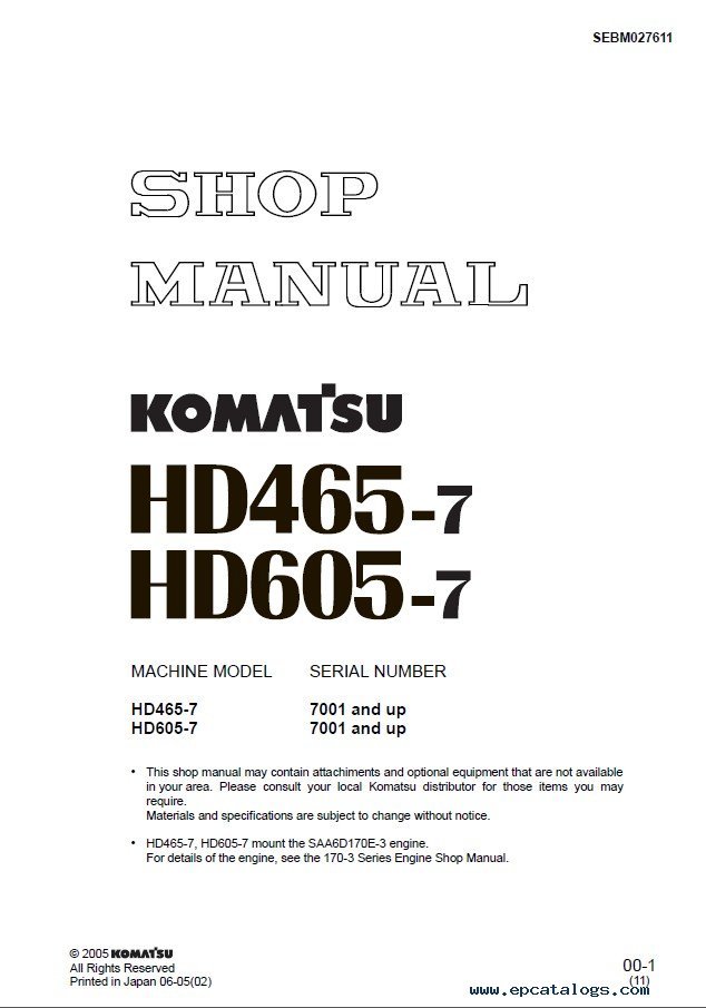 []This set includes detailed shop manual, operation and maintenanc manuals, field assembly instructions for dump trucks Komatsu HD465-7 and HD605-7.
