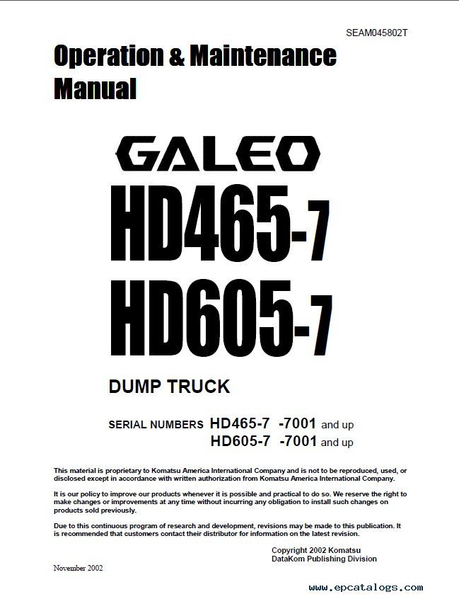 - Komatsu Galeo HD465-7, HD605-7 Dump Truck Operation & Maintenance Manual - 279 pages.