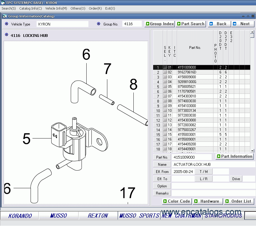 The catalog SsangYong EPC contains the following models - Rodius / Stavic, Kyron, Musso, Musso Sport, Chairman, Korando, Rexton, Actyon.