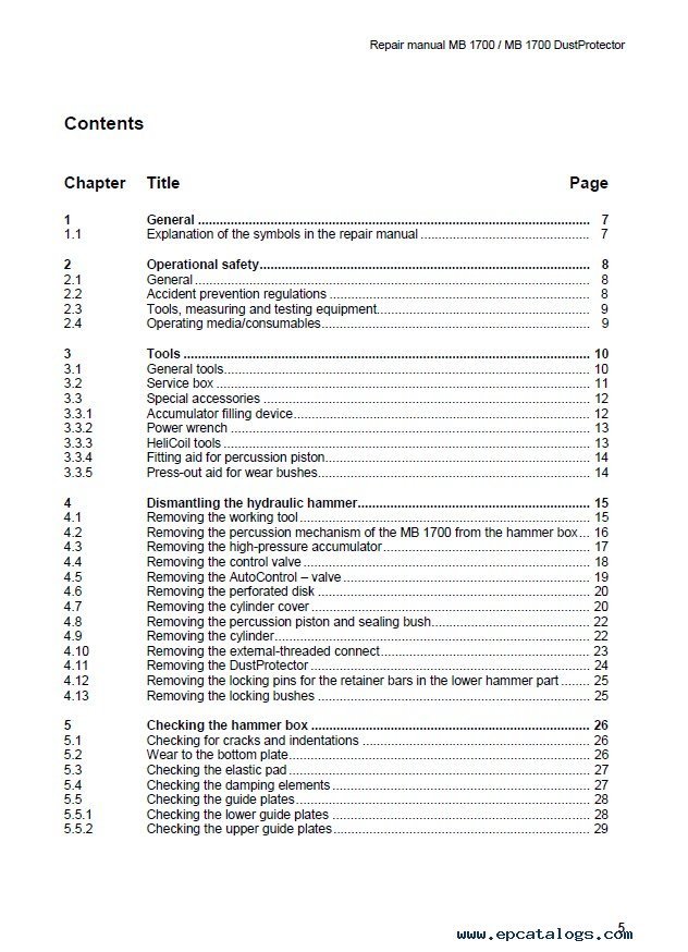 Athough this repair manual applies to all versions of the MB 1700 hydraulic hammer, the manual refers only to the MB 1700, called hydraulic hammer, by way of simplication.
