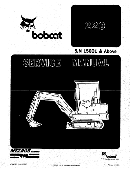This manual contains detailed repair and service information for Bobcat excavator 220, special instructions for repair and maintenance, technical specifications, diagrams and circuits, service, and troubleshooting information.