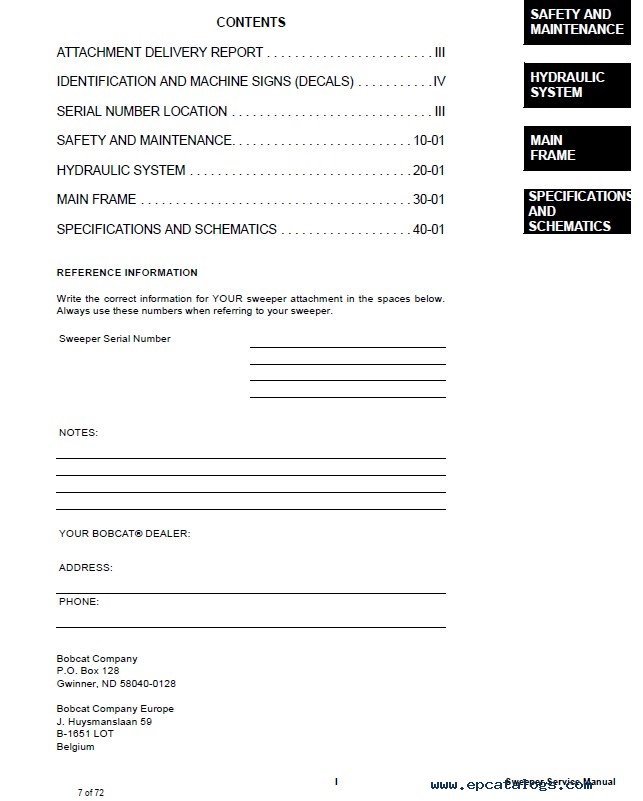 This service manual contains a lots of illustrations, schematics and diagrams that help to carry out installation or removal of any parts of Bobcat sweepers.