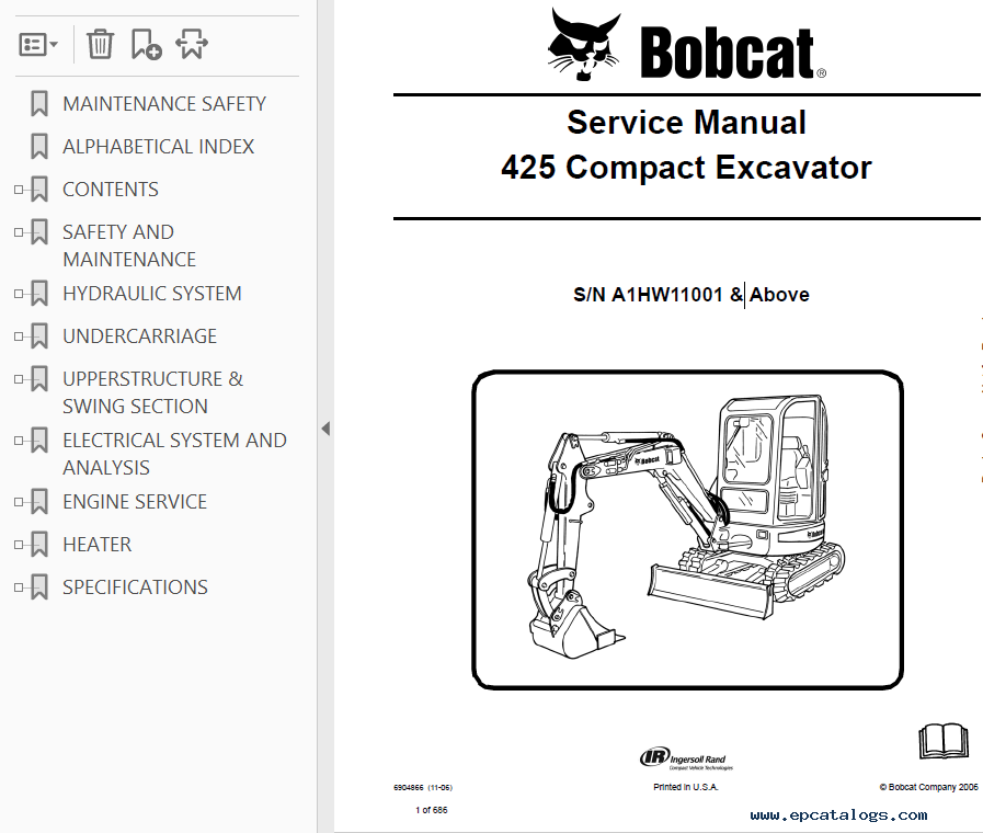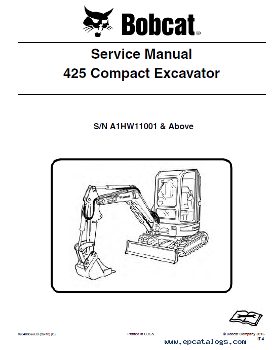 Note: The technical information for Bobcat Compact Excavator 425 model is contained in 2 PDF files. Year of the release of manuals 2007 and 2016.