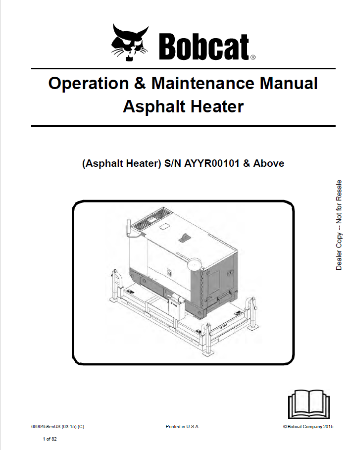 [2015]This Operation & Maintenance Manual was written to give the owner/operator instructions on the safe operation and maintenance of the Bobcat attachment. Here you will find helpful and important material divided into several sections with specifications instruction, service procedure, special instruction, troubleshooting for Bobcat Asphalt Heater S/N. READ AND UNDERSTAND THIS OPERATION & MAINTENANCE MANUAL BEFORE OPERATING YOUR BOBCAT ATTACHMENT.