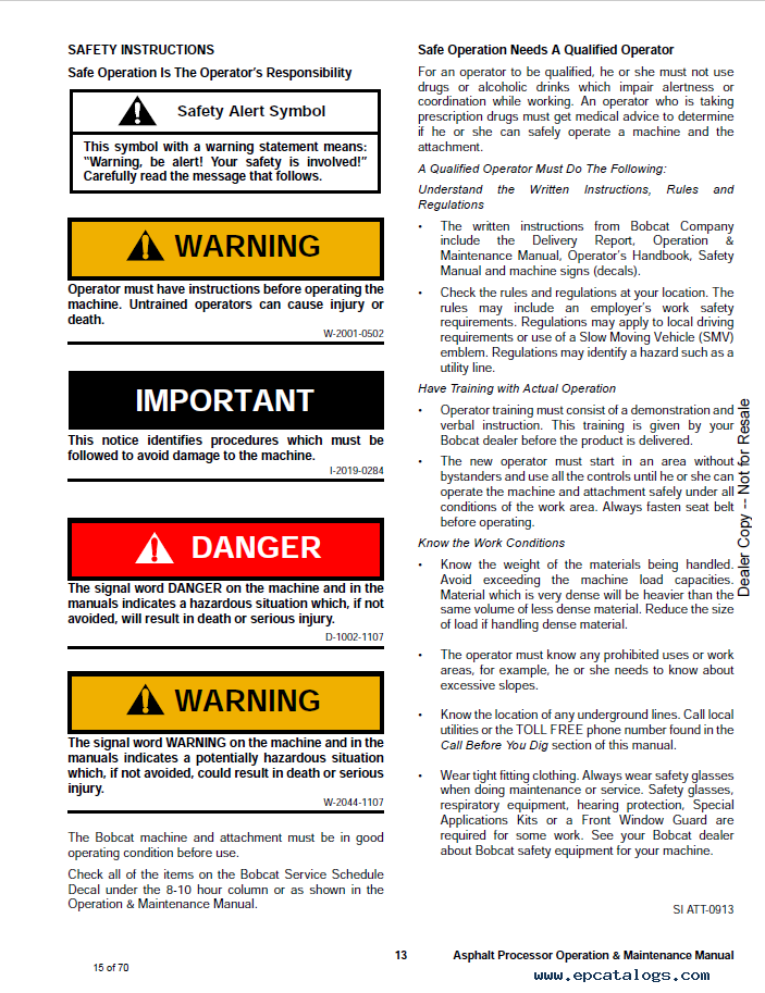 [2015]We hope that we will provide you with a valuable tool for the operation and maintenance of the Bobcat Asphalt Processor S/N. The electronic guide covers information about safety rules, operating instructions, preventive maintenance, specifications, many illustrations, different schemes, and diagrams for your device. Practicing the instructions given here will result in many years of dependable service to your device.