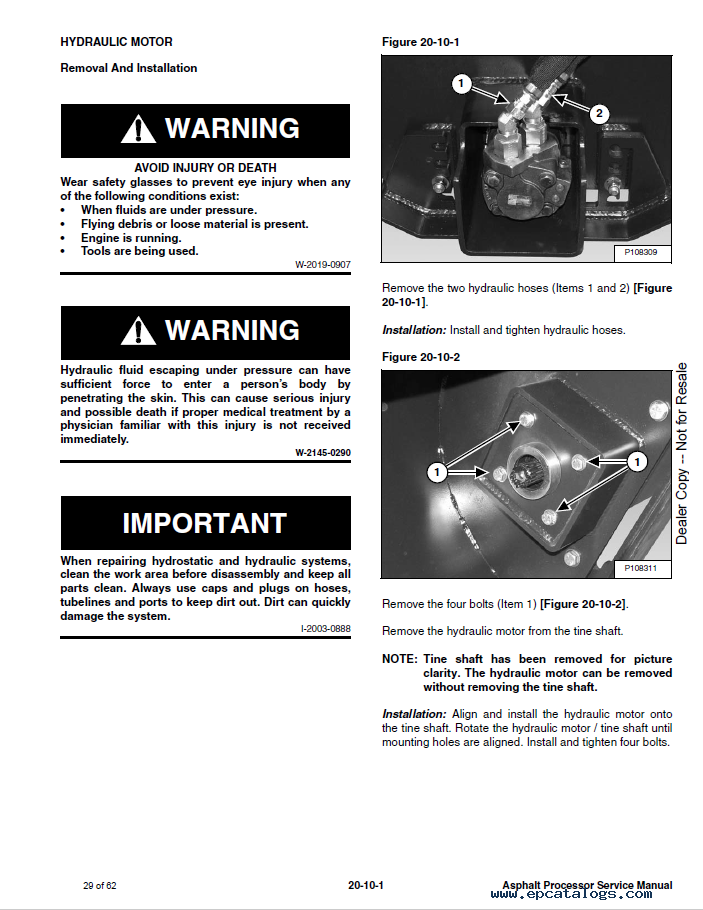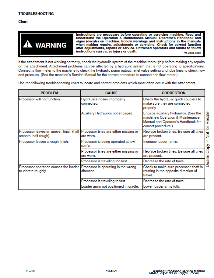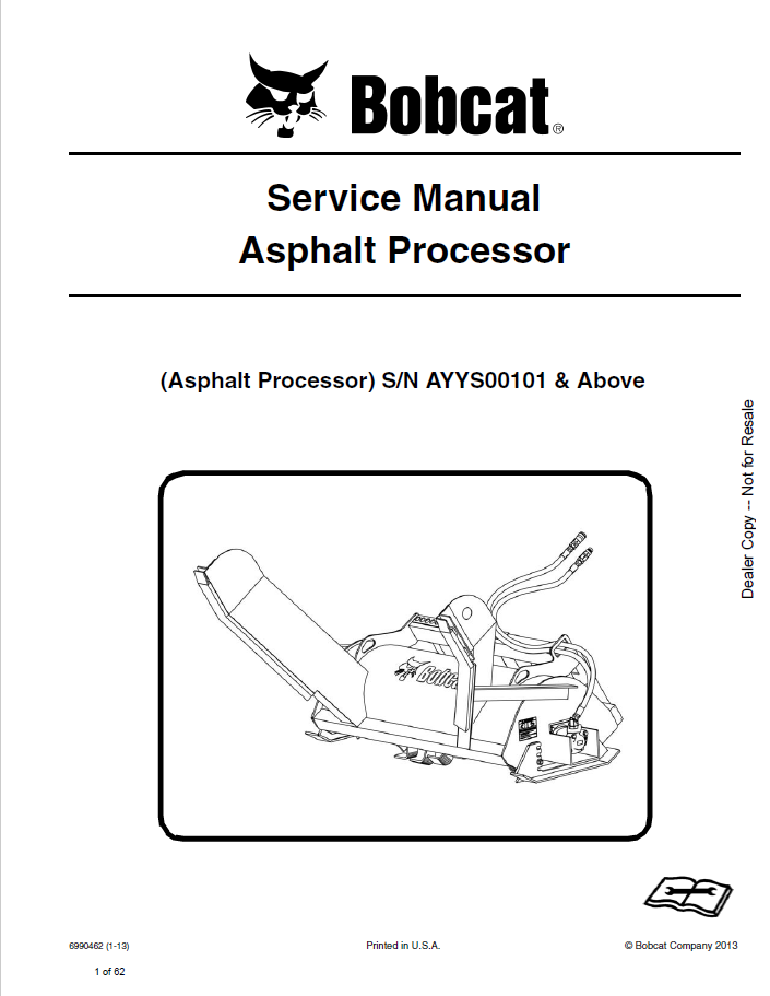 Please read carefully the Bobcat material before you start any procedures with your instrument. This will help protect you from various technical breakdowns and serious injuries and will also extend the life of your Asphalt Processor. Factory file comes in PDF format with 62 pages for reading. We recommend using Adobe PDF Reader, to be sure all images/graphics will display correctly. The information in this service manual is in English.