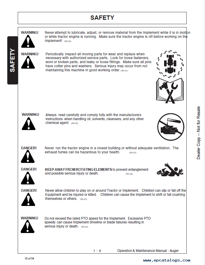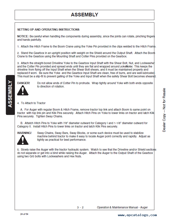 [2006]Description in this Operation and Maintenance Manual for Bobcat Auger 3PTA. Factory material includes maintenance instruction, operation section, safety rules, setting chapters, specifications, and also, photographs and drawings, charts, diagrams. All implements with moving parts are potentially hazardous. BEFORE YOU START!! Read the safety messages on the implement and shown in your manual. Observe the rules of safety and common sense!