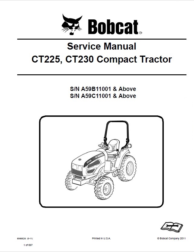 [05/2011]The service manual provides detailed service and repair information, instructions for use and installation, designed for repair Bobcat Compact Tractors CT225, CT230.
