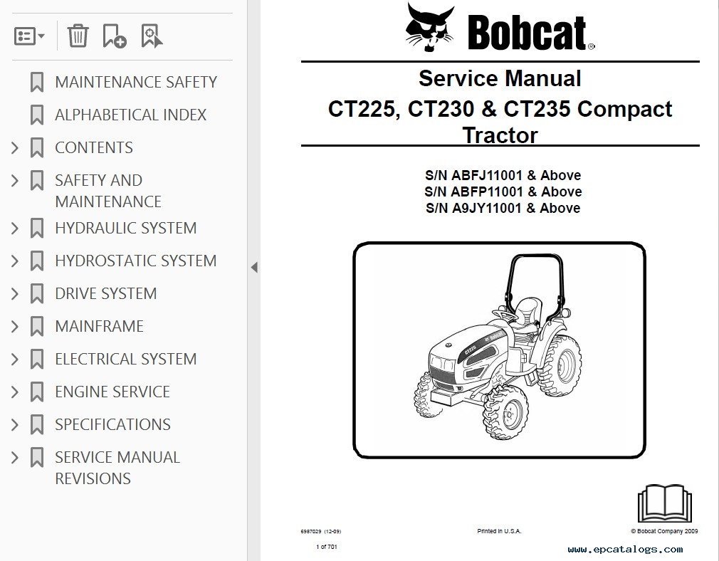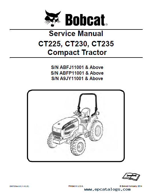 Note: this product covers service manuals from the 2009, 2011, and 2014 years for Bobcat Compact Tractors CT225, CT230, CT235 models.