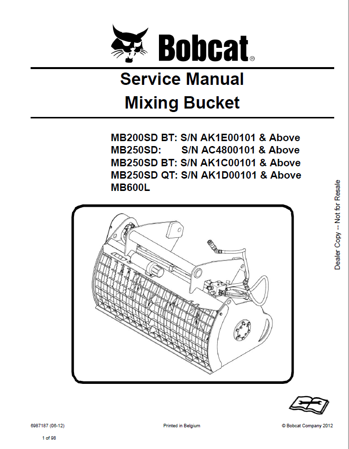 [2012]This service information is designed for high-quality use, maintenance, and troubleshooting of Bobcat Mixing Bucket MB200SD/250SD/600L. In preparing this tutorial, we hope we have furnished you with a valuable tool for operating and maintaining this Bobcat device.