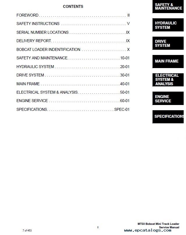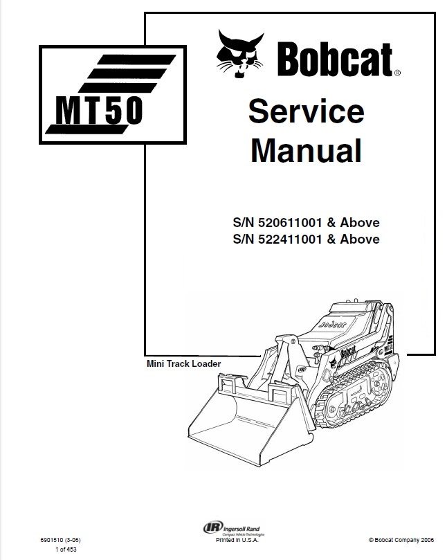 [03/2006]This Service manual provides necessary servicing and adjustment procedures, repair instructions, and troubleshooting for the Bobcat Mini Track Loader MT50 and its components.