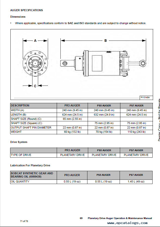 Bobcat Planetary Drive Auger PR3, PS5, PS7 Operation and Maintenance Manual PDF