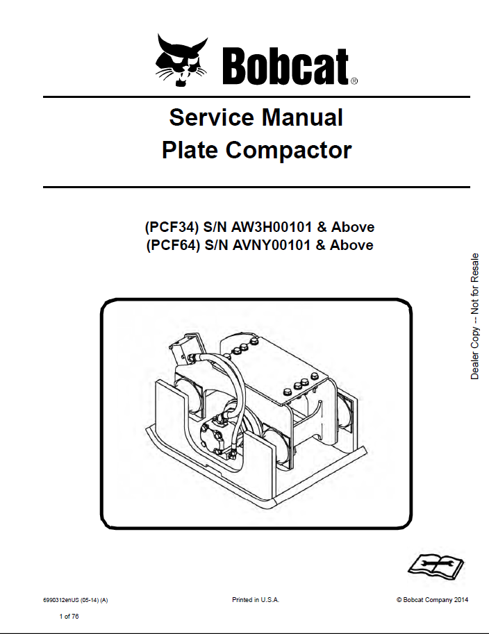 [2014]The Service Manual is a complete information book that contains a lot of important and useful material for the Bobcat Plate Compactor PCF34, PCF64 models. An electronic guide will help you correctly and accurately use your device and solve any problems.