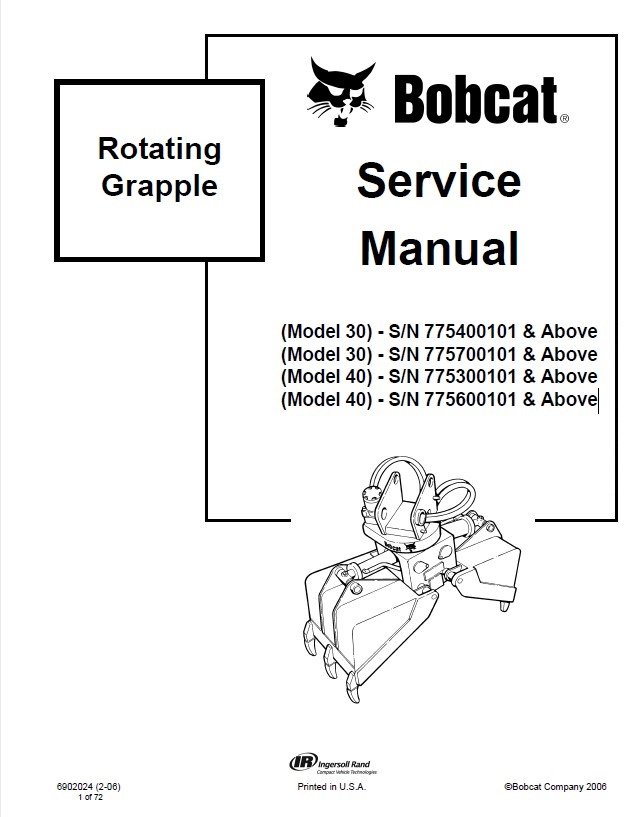 The service manual contains repair and maintenance information, diagrams and circuits, and technical specifications for Bobcat Rotating Grapple 30 and 40 Models. The service manual includes maintenance instructions, illustrations, and diagrams, troubleshooting information, etc.