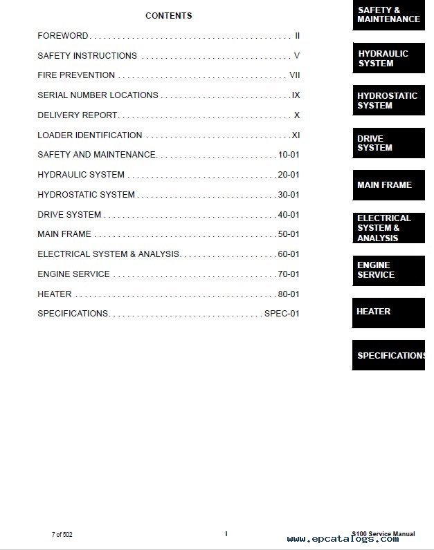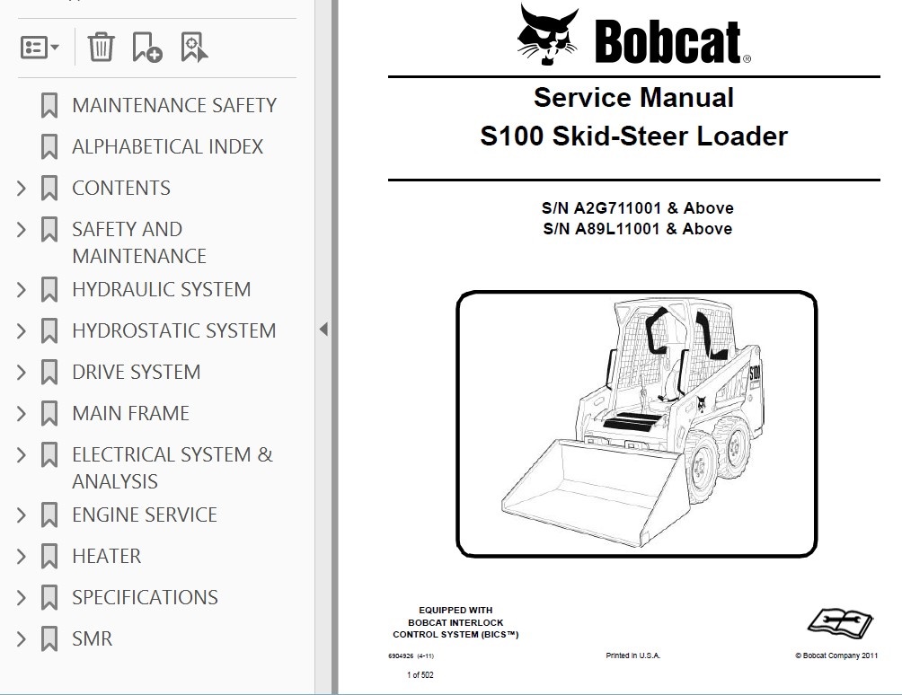 Note: this product covers 8 PDF files for Bobcat Skid-Steer Loader S100 model. Use them together for complete information.