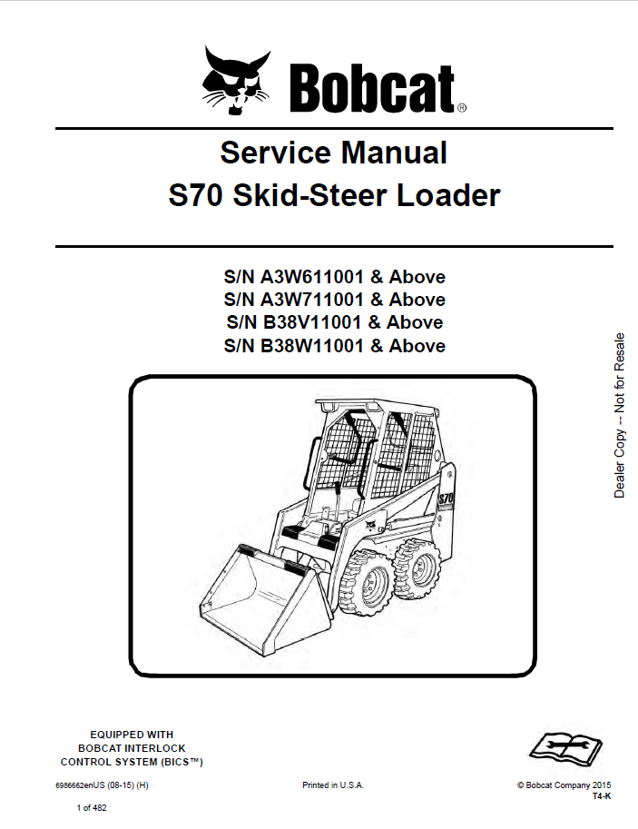 This Service manual provides necessary servicing and adjustment procedures for Bobcat Skid-Steer Loader S70 and its component parts and systems. Also, this material includes safety rules, maintenance, specifications section, engine service instruction, many helpful illustrations, different diagrams and schemes.