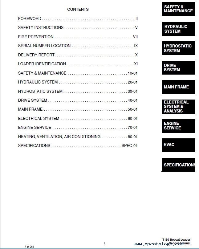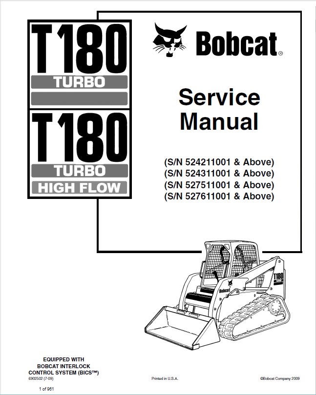[07/2009]Service manual provides detailed service and repair information, safety instructions, preventive maintenance information, specifications for Bobcat Loaders T180 Turbo, T180 Turbo HF.