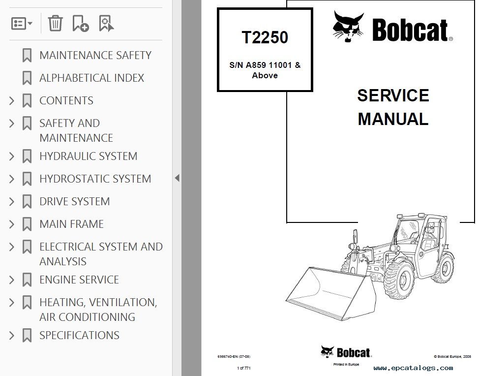 Note: this product covers several PDF files for Bobcat Telescopic Handler T2250 model of 2008, 2010, and 2012 years. Use them together for complete information.