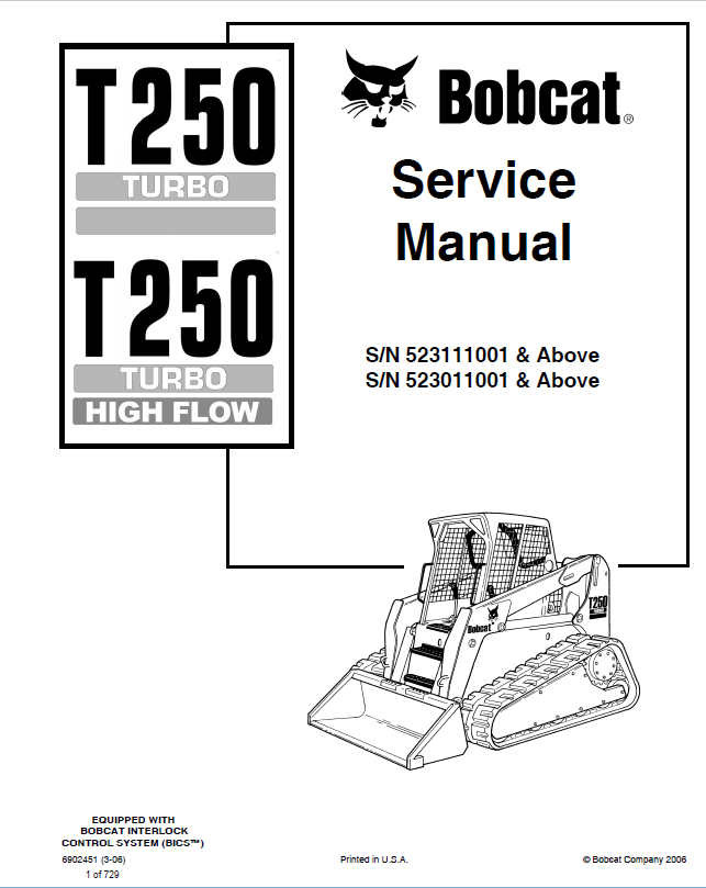 [03/2006]This service manual contains technical service information, safety and preventive maintenance information, diagrams, fitting instructions, technical specifications, and assembly instructions for Bobcat Loaders T250 Turbo, T250 Turbo High Flow. A manual is a detailed source of important service information for Bobcat loaders who want to improve the quality of maintenance and repair of Bobcat equipment.