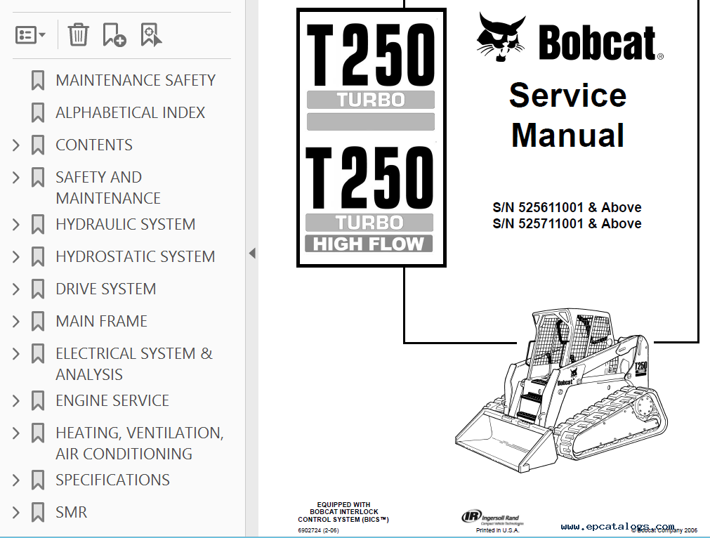 Note: this product covers 2 PDF files for Bobcat Loaders T250 Turbo, T250 Turbo High Flow models.