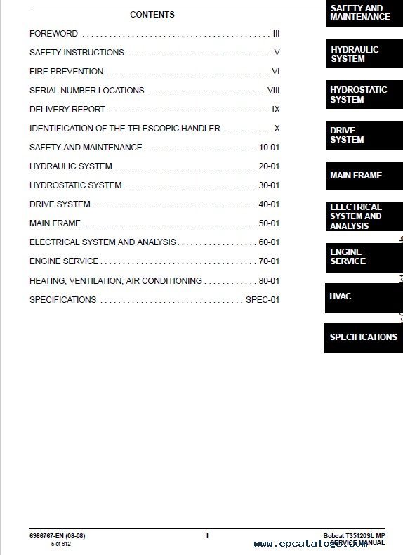 Note: Information for this Bobcat T35120SL MP Telescopic Handler model is contained in two files of 2008 and 2012 years.