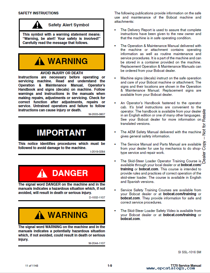 [2016]The purpose of this Service Manual is to help in the efficient use and technical maintenance of the Bobcat T770 Skid-Steer Loader model. Factory file includes the next important sections: repair instructions, maintenance, technical data, the section about the engine service, specifications, system section, setting, and also, many pictures with descriptions, different diagrams, and schemes for Bobcat equipment. It is important to know how to properly perform any procedures for the long-term quality work of your technic without any problems (breakdowns, malfunctions, damage, and failures).