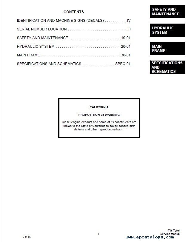 [1999, 2006, 2012]The Service Manual is developed for the Bobcat Tilt-Tatch. Electronic guide provides safety and maintenance information, special instructions, specifications, troubleshooting, many screenshots, diagrams and schematics, intended to serve and repair Bobcat Tilt-Tatch. Also, this tutorial allows to easy repair and service of material, serial number location, identification, and machine signs, etc. First of all, we advise you to read and understand all of the safety precautions and warnings before performing any maintenance to avoid any breakdowns or injuries to your device.