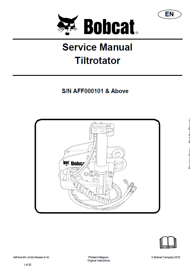 [2010]We invite you to buy and familiarize this Service Manual which was written especially for the Bobcat Tiltrotator of the 2010 year. This electronic guide will help you quickly and confidently get acquainted with your device, perform service, step by step repair, fix any problems, and keep the Bobcat product efficient over time. The tutorial includes several sections about technical data, special instruction, setting, troubleshooting, safety rules, specifications, illustrations and schemes, diagrams, and other general material.