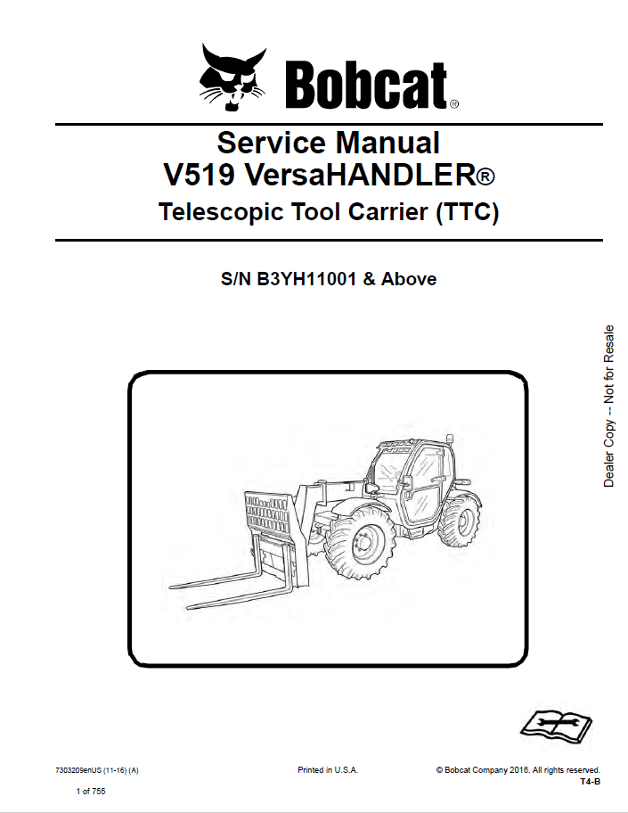 [2016]On this website, you can familiarize yourself with the Service Manual for correct use, technical maintenance, and repair instruction of the Bobcat V519 VersaHANDLER Telescopic Tool Carrier model.