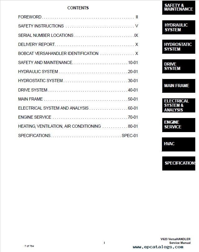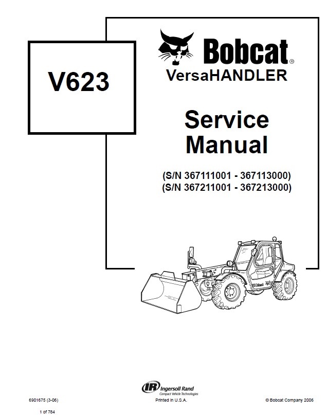 [03/2006]This service manual provides detailed technical service information, safety and maintenance instructions, specifications, diagrams, designed to serve Bobcat VersaHANDLER V623.