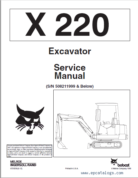 [06/2012]This service manual contains detailed repair and service information, special instructions for repair and maintenance, technical specifications, diagrams and circuits, service, and troubleshooting information for Bobcat Excavator X220.