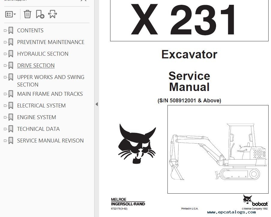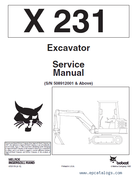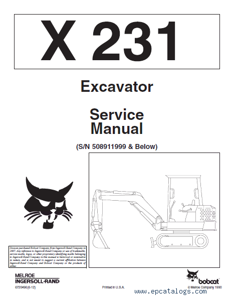 [1990/2012]This service manual contains technical information on repair, service, and maintenance instructions for Bobcat excavators X 231.