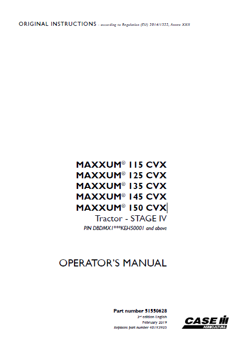 [2019]Case tractors are constantly improved in order to increase their efficiency and reliability. This manual sums up all the information regarding the most recent techniques applied at the time of commissioning the machine. This manual is an integral part of the tractor's Maxxum series and must accompany it, even when it is resold, until its final disposal.
