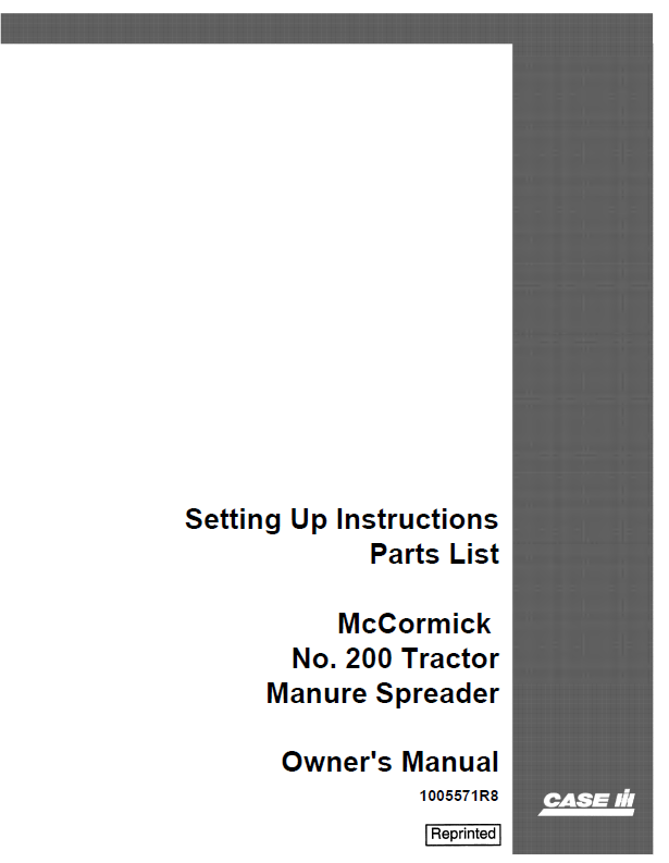 [2001]The operator's manual for the Case McCormick No.200 tractor manure spreader is your assistant which helps use and operate the tractor and his pars.