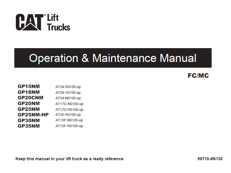 []This PDF Operation & Maintenance Manual contains the information necessary for the operation and “do-it-yourself” maintenance of Cat Lift Trucks GP15NM, GP18NM, GP20CNM, GP20NM, GP25NM, GP25NM-HP, GP30NM, GP35NM Models.