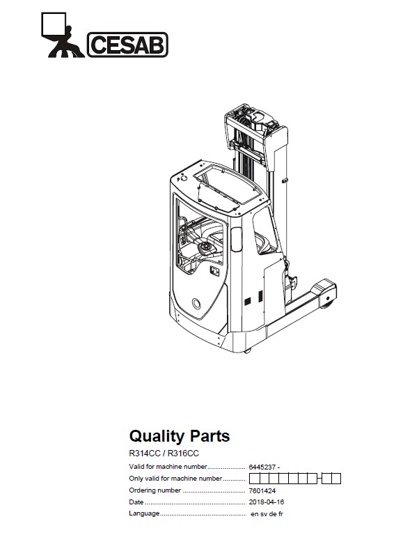 [2018]For the selection of the necessary spare parts and accessories for Cesab Reachtrucks R314CC, R316CC Models, you need to purchase this PDF Quality Parts Manual.