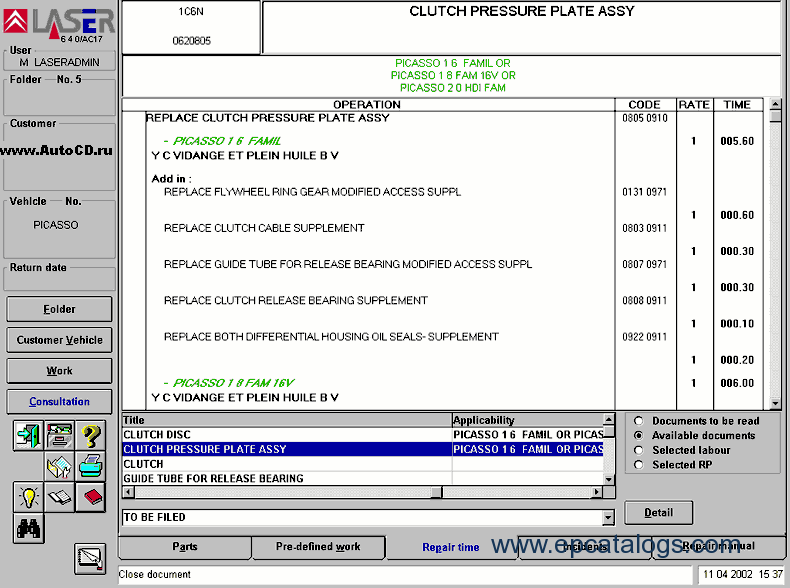 Electronic catalogue CITROEN LASER contains the full information on all automobiles of firm, including new models 2005. The program occupies 1 DVD + 1 CD, supports some languages. The catalogue Citroen LaserTec contains the information on details, нормо-hours, repair, service and diagnostics, including ALL electrocircuits, there is a work on VIN or on model, decoding of each position VIN. The program is whimsical enough in installation (because of drivers of very known firm), therefore it is more preferable to put it on clean (Windows+Office) a computer.