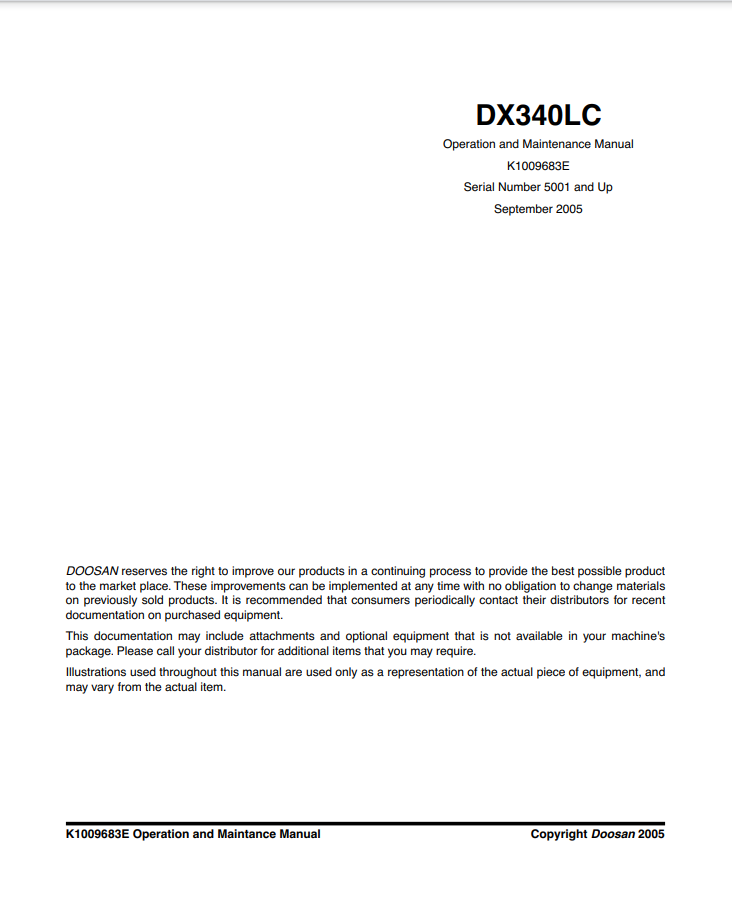 [2005]Attention, please! On our website, we want to present the Operation and Maintenance Manual of the Doosan Daewoo Excavator DX340LC models. Factory file provides detailed material about proper service, safety rules, specifications, maintenance, operation, troubleshooting, adjustment, many images, schemes, and diagrams, etc. Also, all information, instruction, and screenshots in this tutorial help to quickly and easily calibrate, troubleshooting, and fix problems.