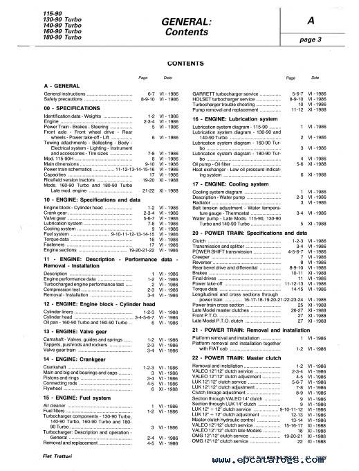 []This PDF Workshop Manual provides detailed service information, repair instructions, technical specifications, that help to perform maintenance procedures of the Fiat Tractors 115-90 Turbo, 130-90 Turbo, 140-90 Turbo, 160-90 Turbo, 180-90 Turbo Models.