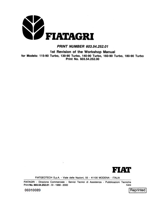Fiat Tractors 115-90 Turbo, 130-90 Turbo, 140-90 Turbo, 160-90 Turbo, 180-90 Turbo Workshop Manual