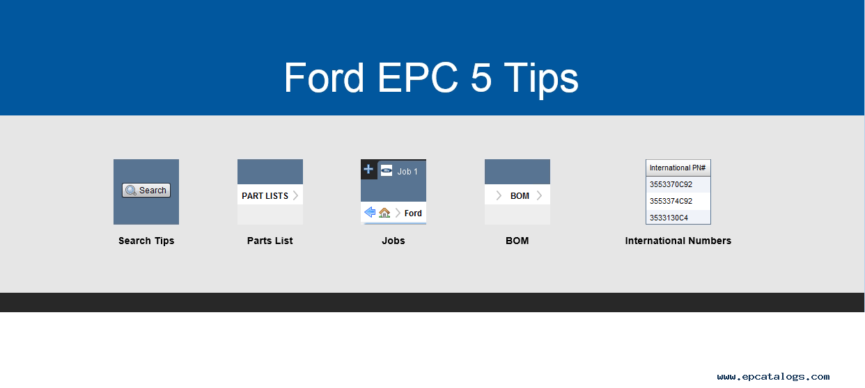 [2018]EPC 5 for Ford - this is packed mission-critical features into a streamlined, to make search easier and accurate. EPC 5 for Ford contains the full bill of materials (BOM) for cars, light trucks, and medium trucks.