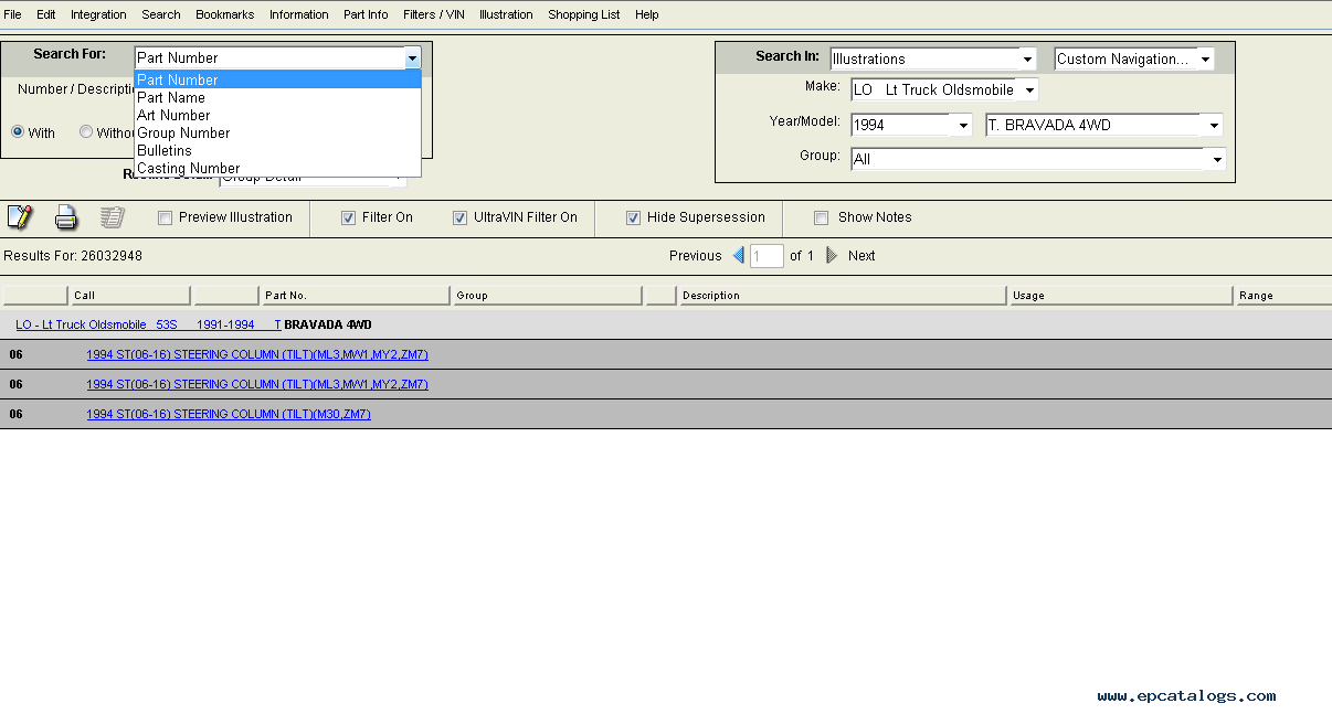 This parts catalog includes simple search function. Search feature provides several search options. You can search for a: