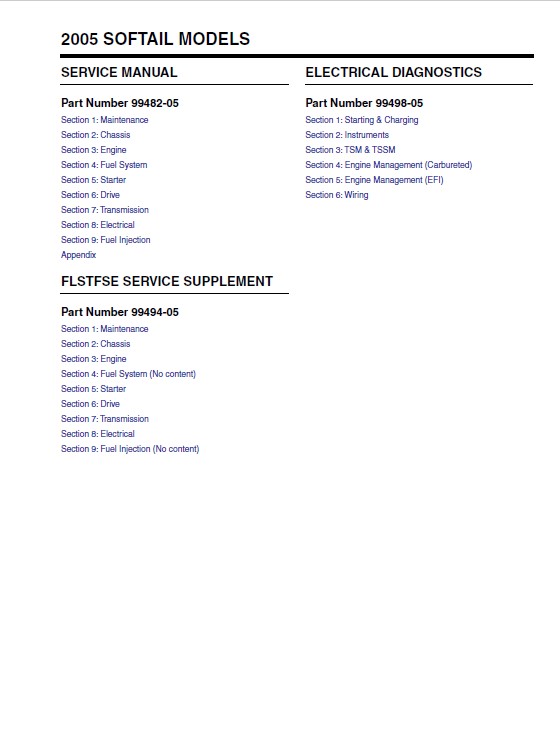 These PDF Manuals contain useful service repair information, wiring diagrams, disassembly schemes for various components and assemblies, description, and specifications of the Harley Davidson Motorcycles Softail Models 2005.